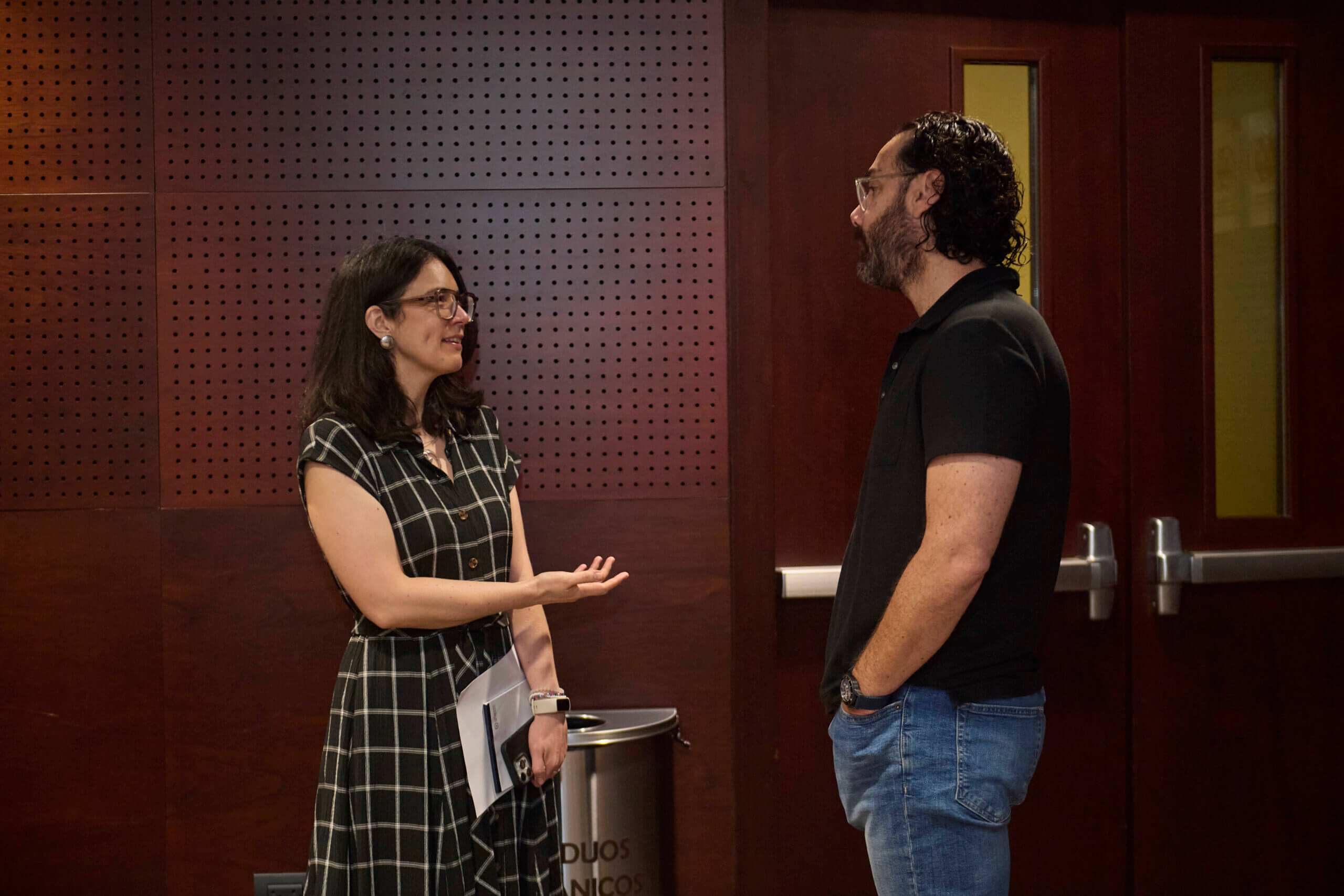- Verónica Contreras y José Luis Gamboa conversando durante el evento de la Escuela de Negocios Vivaldi y Pacífico sobre IA.